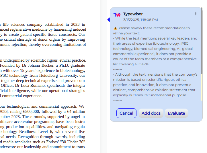 Get on-demand feedback on quantity, quality, and relevance of information in your text – the maxims of effective communication. Typewiser knows what evaluators look for and will guide you in checking all the boxes.