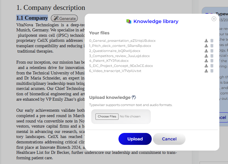 Build a personalised Knowledge Library with information from your company or project – from PDFs, Word, and PowerPoint to audio files – and let Typewiser use it to help you write a proposal tailored to any programme.
